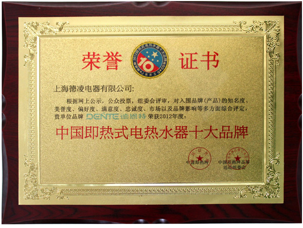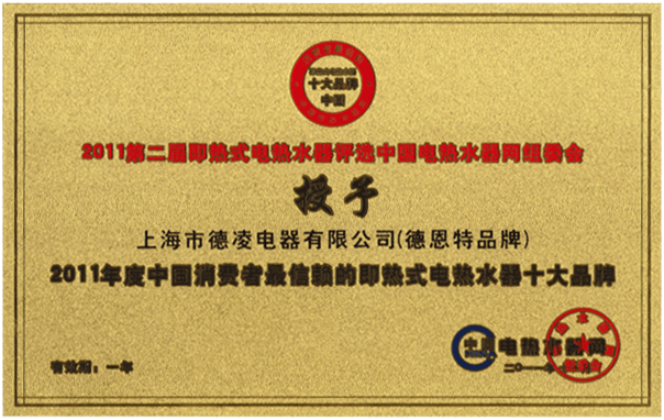 根據(jù)網(wǎng)上公示、公眾投票,組委會評審,為入圍品牌(產(chǎn)品)的知名度、美譽度、偏好度、滿意度、忠誠度、市場以及品牌影響等多方面綜合評定,上海德凌電器有限公司品牌德恩特榮獲2012年度中國即熱式電熱水器十大品牌。 【中國即熱網(wǎng)www.jrrsq.com】
