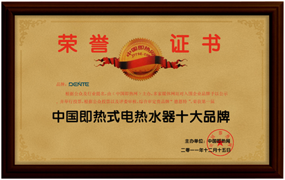 近日,德恩特品牌又被“中國即熱網(wǎng)”(www.jrrsq.com)評為“中國即熱式電熱水器十大品牌”,并榮獲第二名。